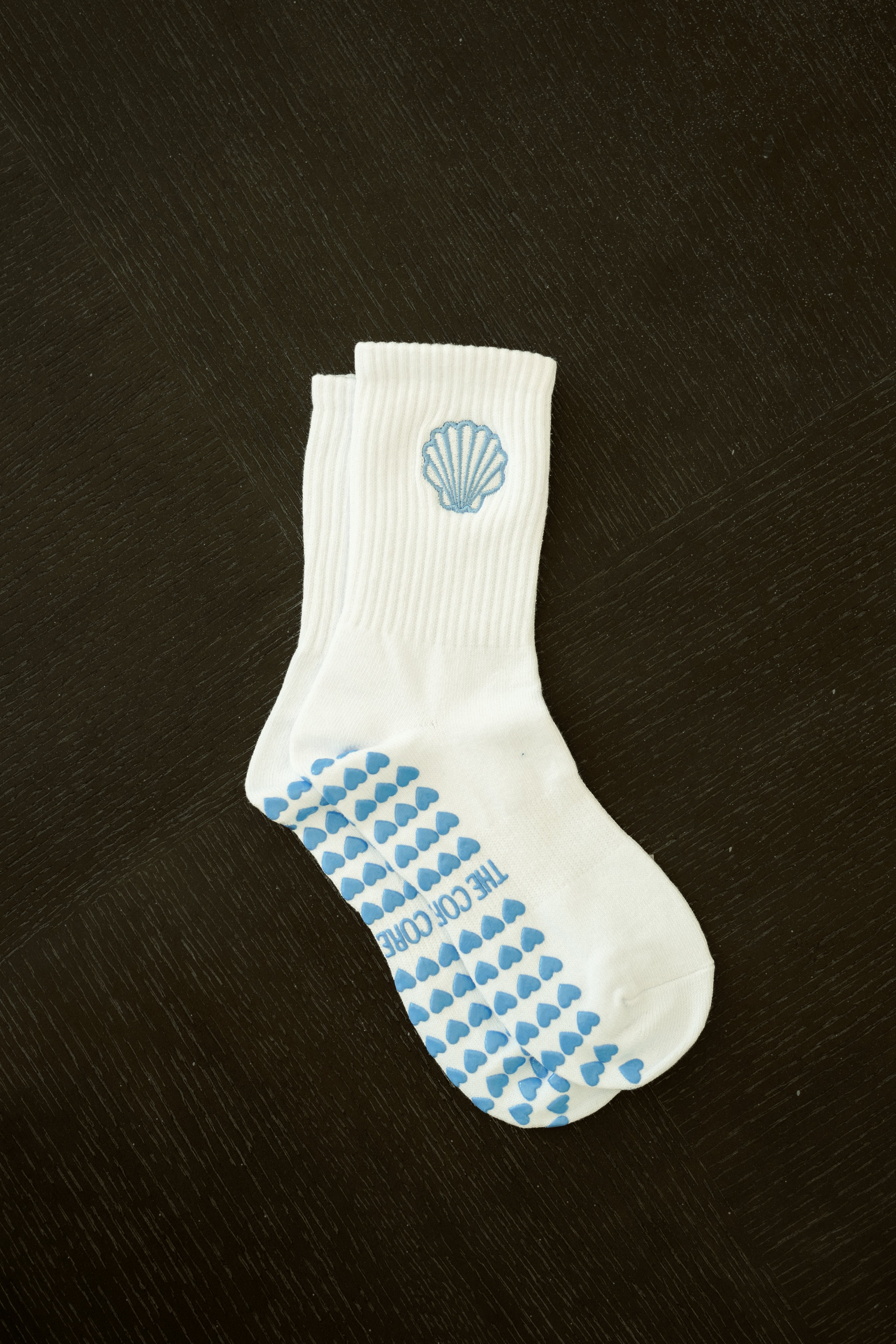 Coastal detail – fresh white sock with a stylish blue seashell accent.