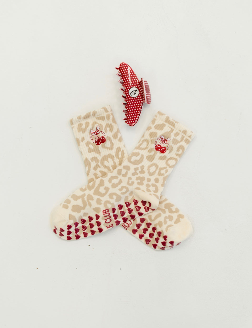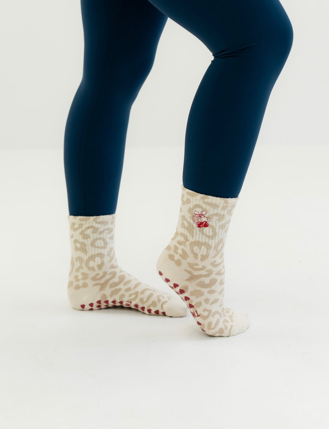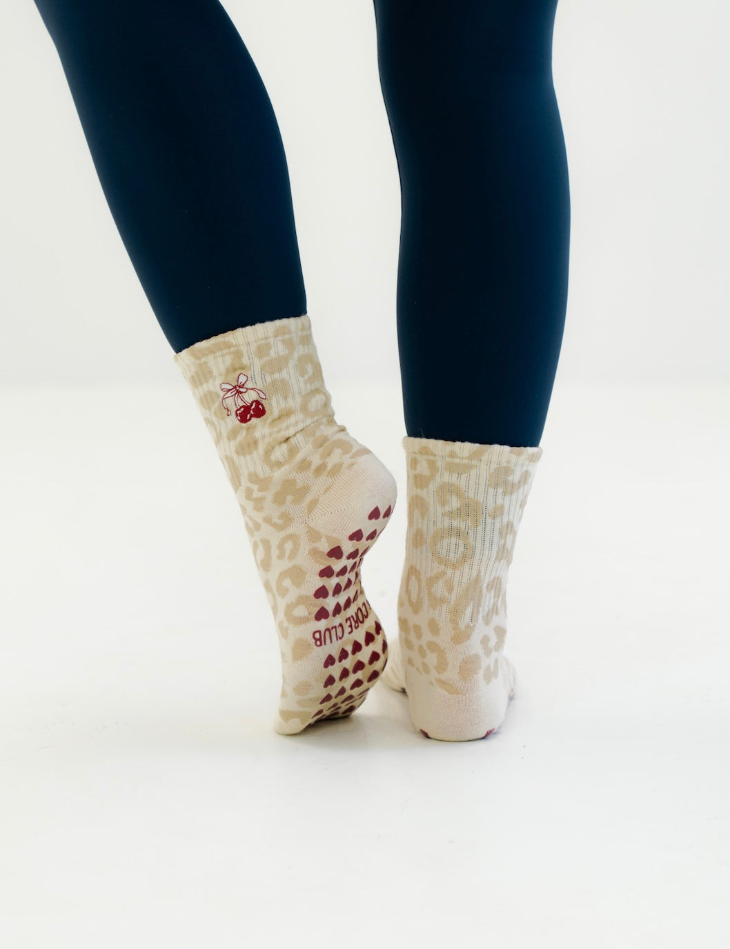 TCC Beige Cheetah Cherry Grippy Socks | Pilates & Barre Essentials