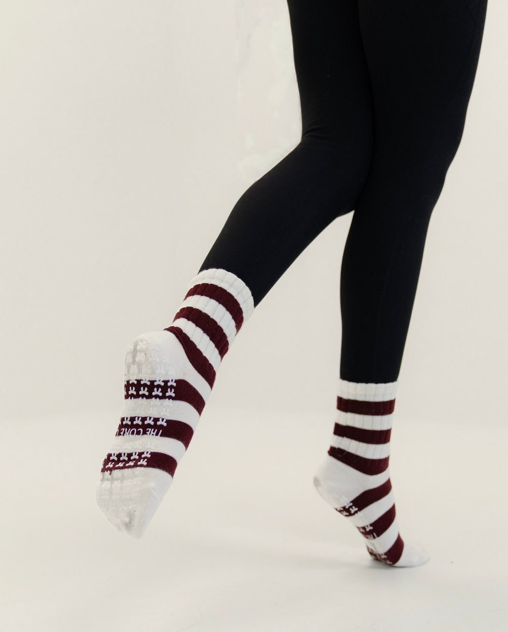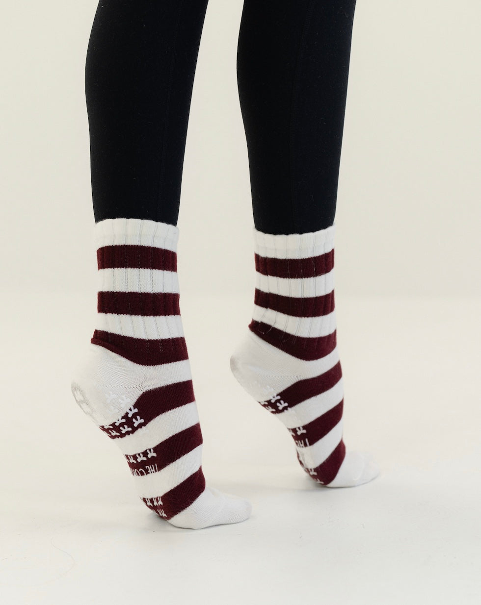 Designed to bring a little holiday magic to every class (no matter the season), these unisex grip socks feature rich burgundy and white stripes with signature white bow-shaped Core Club grippies on the bottom for stability and style. Made from 100% cotton with a comfortable one-size-fits-all stretch, they’re perfect for Pilates, barre, yoga, and beyond—December through all year long.