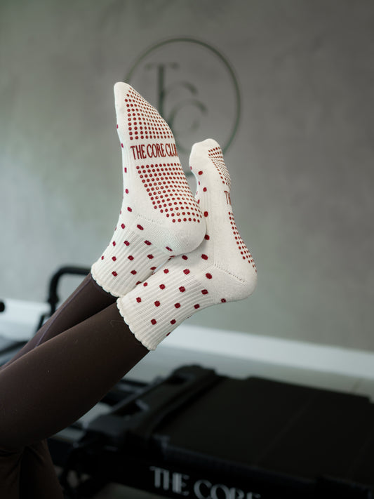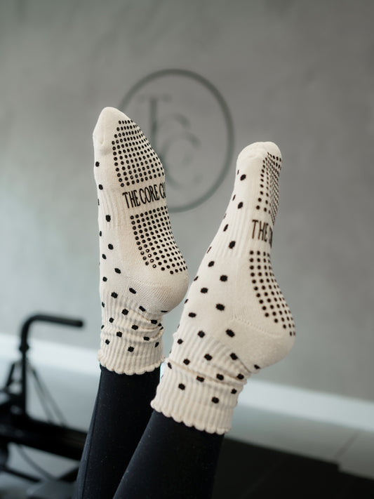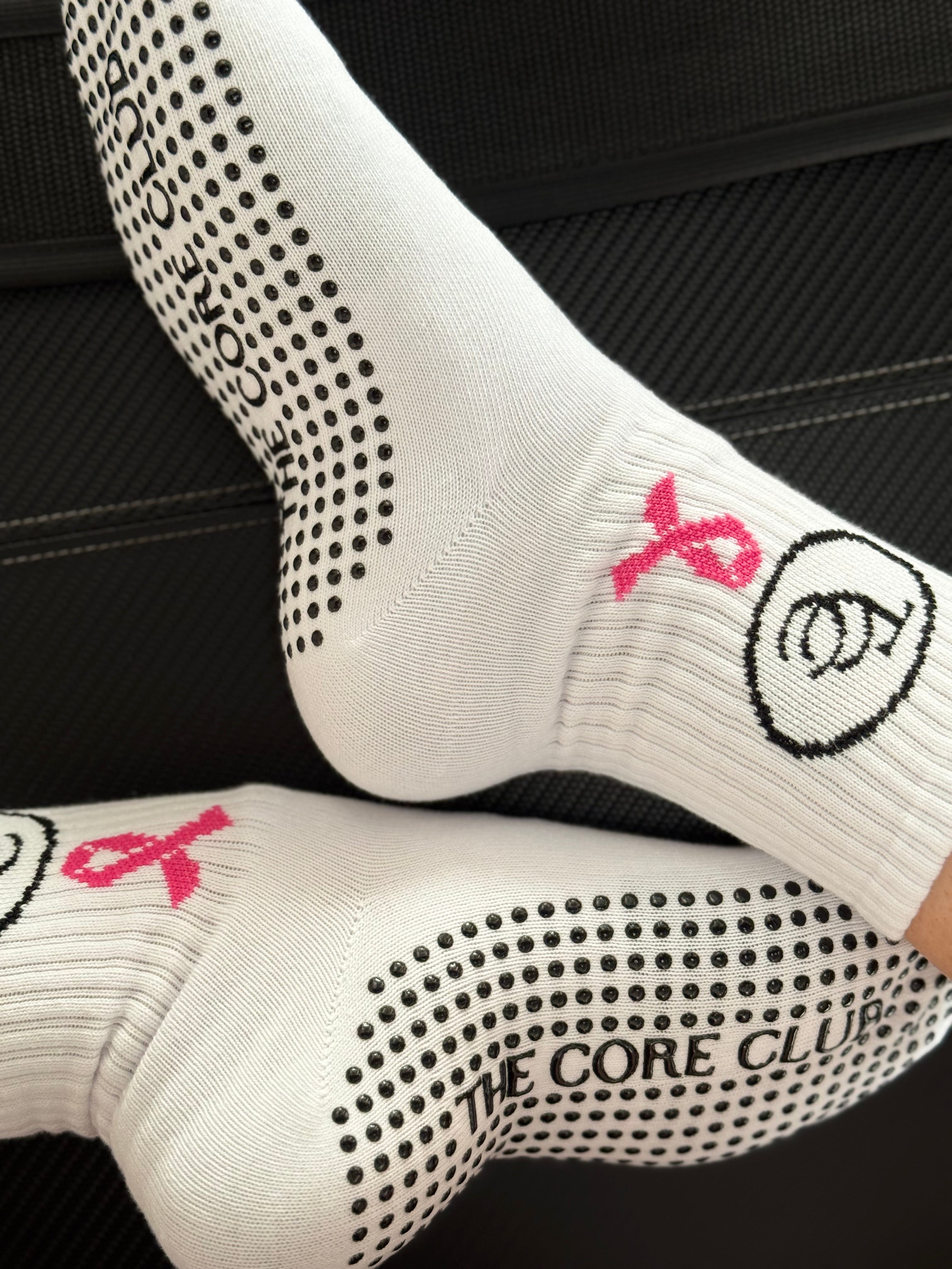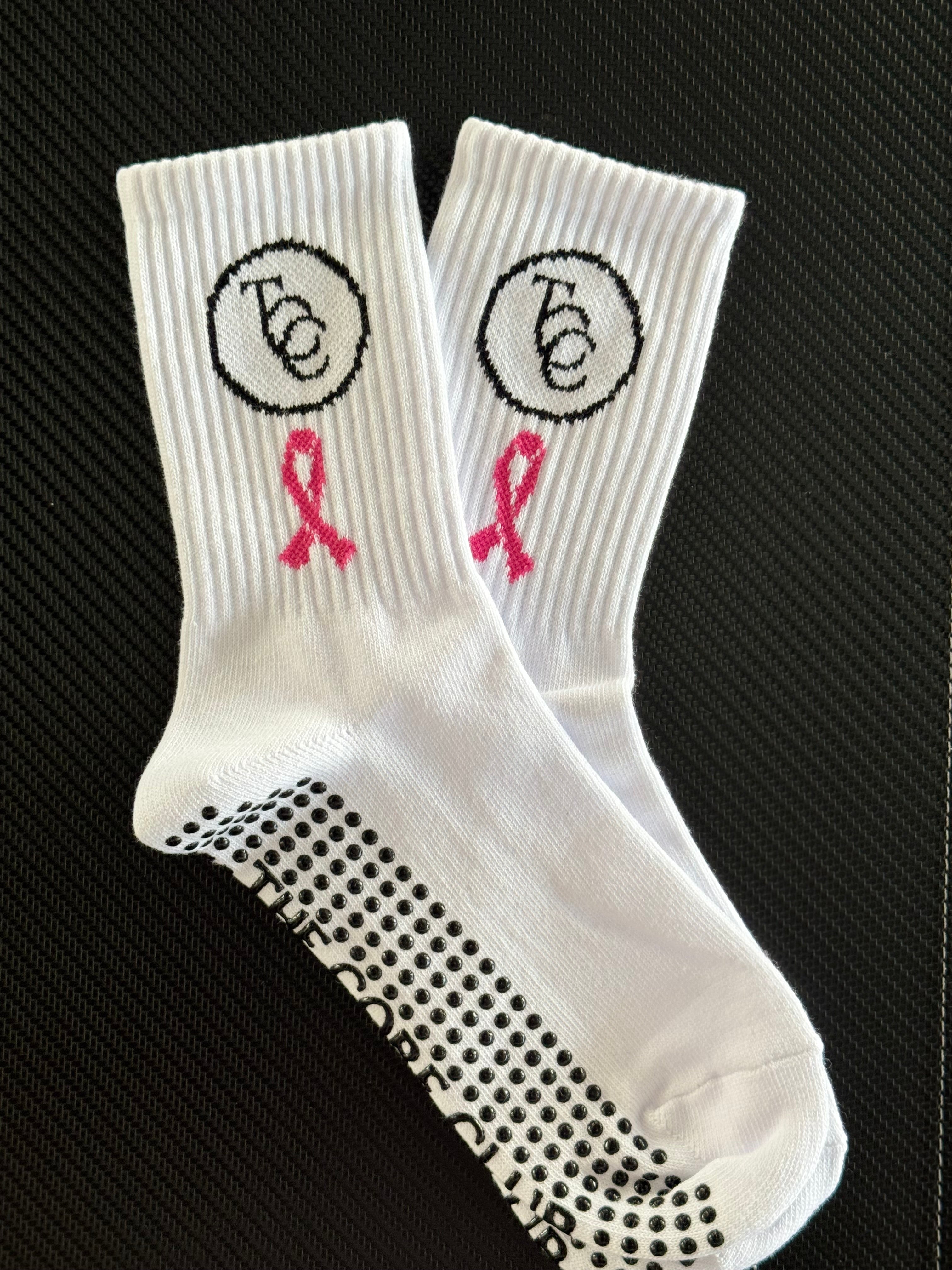 Step into support and style with our signature TCC grippy socks, now featuring a pink Breast Cancer Awareness ribbon embroidered on the side. Designed for comfort and purpose, these socks help make a difference with every step.