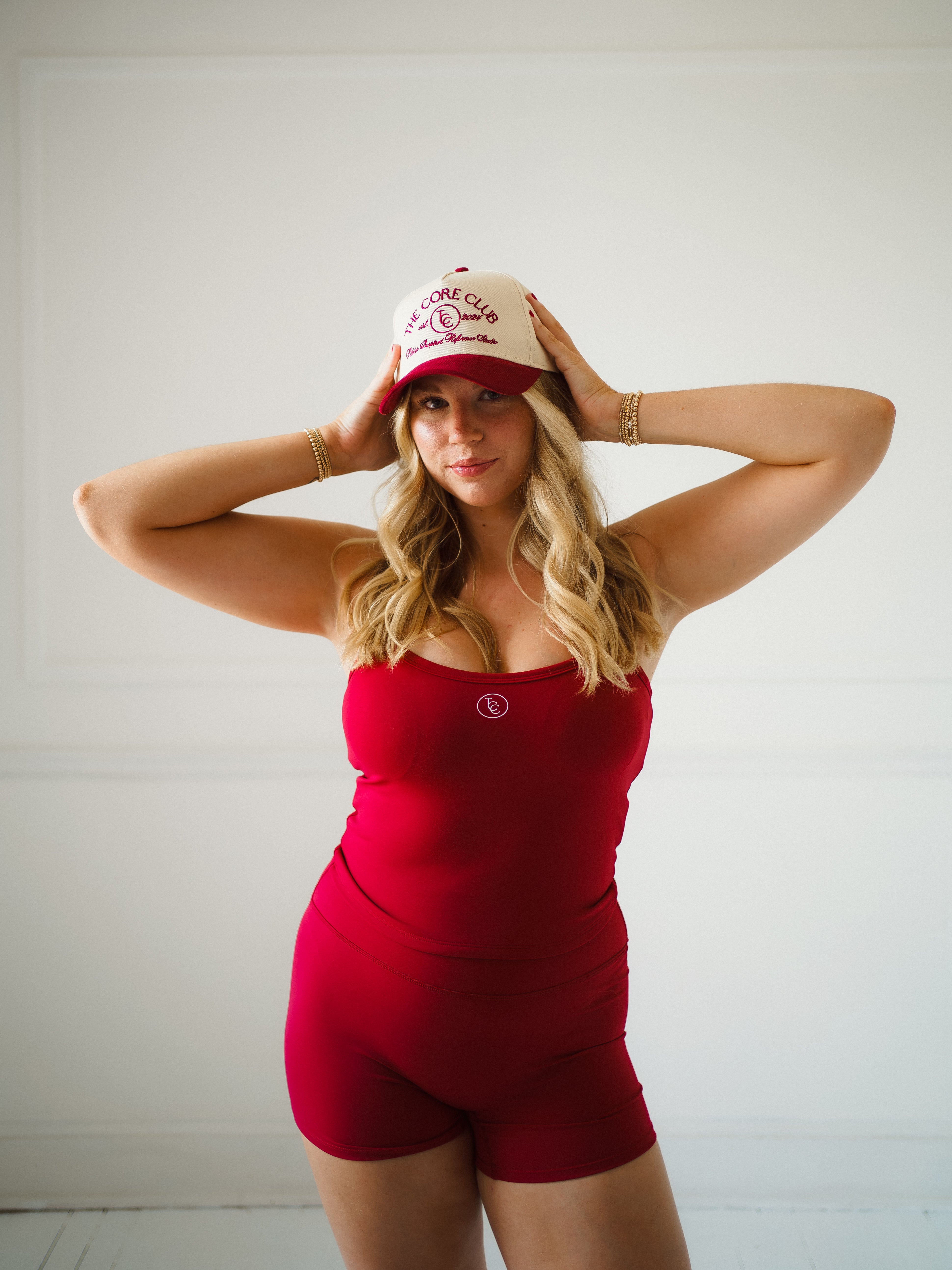 Designed for effortless style, the Core Club Burgundy Baseball Hat is the perfect fall accessory. Featuring a canvas cotton crown embroidered with “the core club” in burgundy, the round TCC circle logo, and the tagline “Pilates Inspired Reformer Studio”, this hat blends neutral versatility with seasonal texture. A rich burgundy corduroy brim gives it a cozy, elevated look—perfect for autumn Pilates sets and everyday outfits.