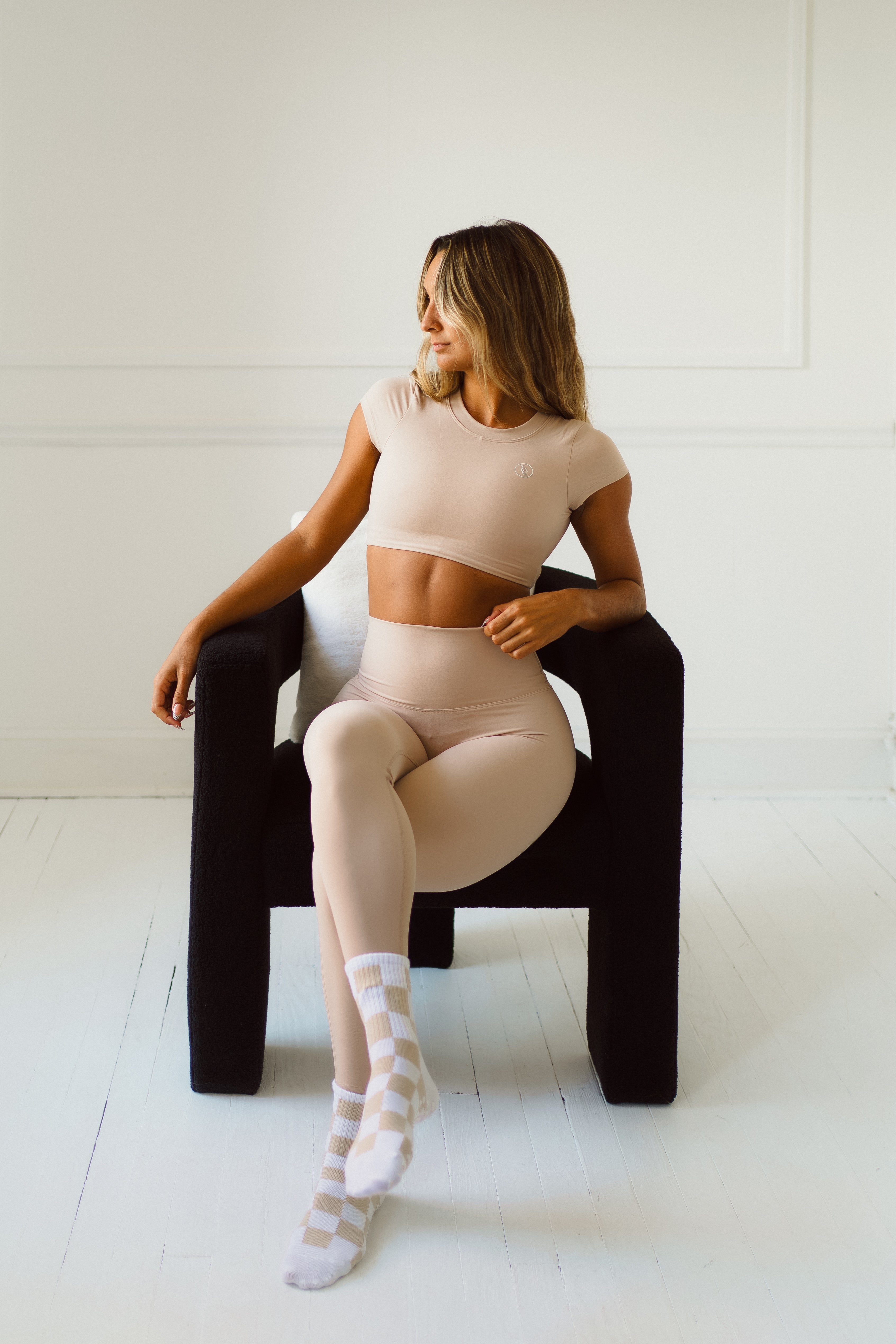 Move with ease in the TCC Sand Cap Sleeve Bra, designed for Pilates, yoga, and beyond. Crafted from buttery soft, breathable fabric, this bra offers a sleek cap sleeve silhouette with a flattering open back design. Removable padding lets you customize your fit, while the soft neutral Sand shade makes it easy to pair with your favorite Pilates sets. Also available in refreshing Mint Blue.