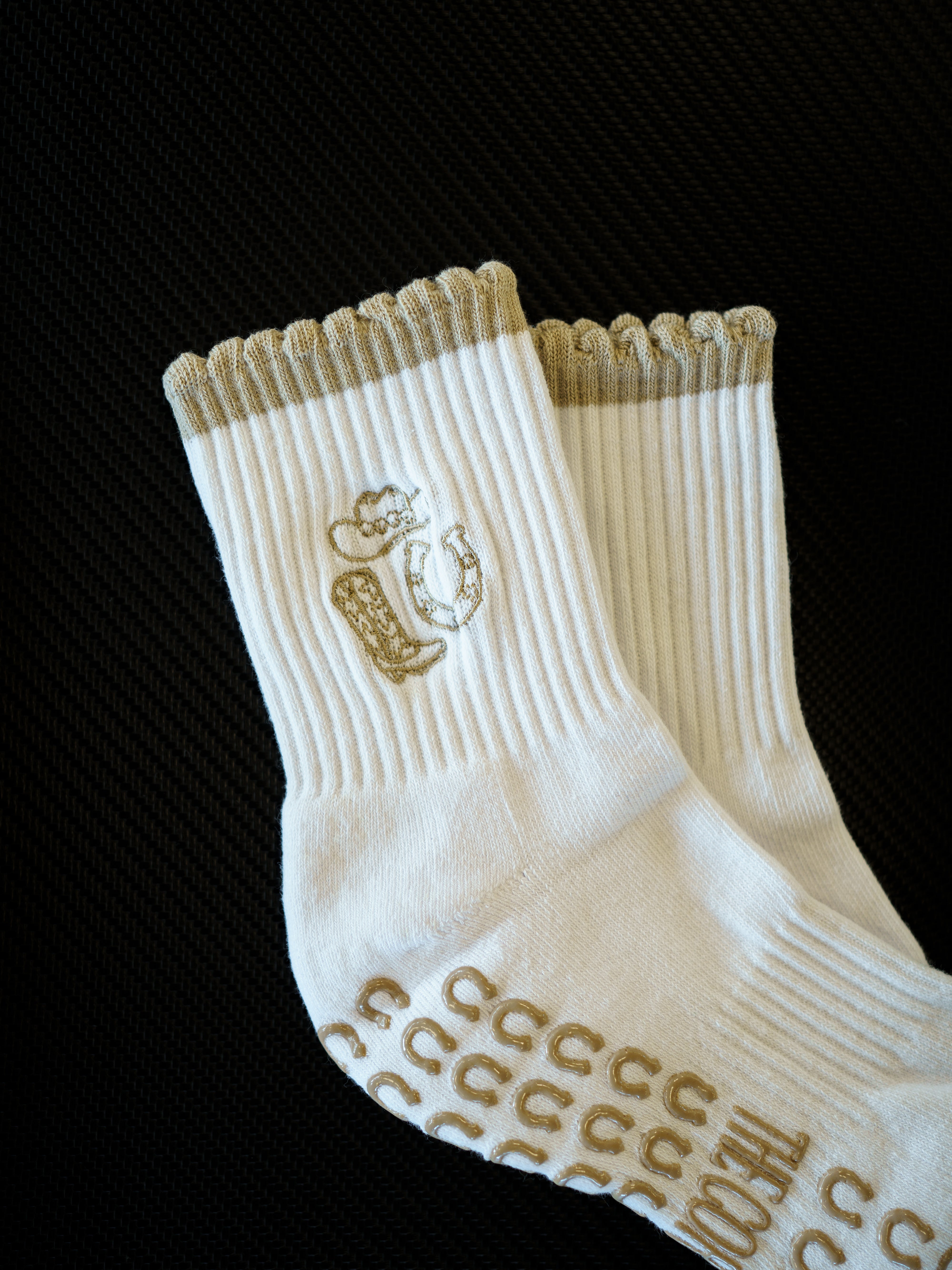 Saddle up for your next class with our TCC Tan Cowgirl Hat, Boots & Horseshoe Grippy Socks — the perfect mix of Western charm and studio-ready function. Neutral, stylish, and perfectly grippy, these socks bring a subtle cowgirl flair to every move.
